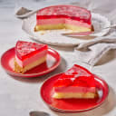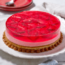 ligera capa de keke de vainilla con manjar, mousse con sabor a fresa, gelatina sabor a fresa con trozos de fresas en su interior